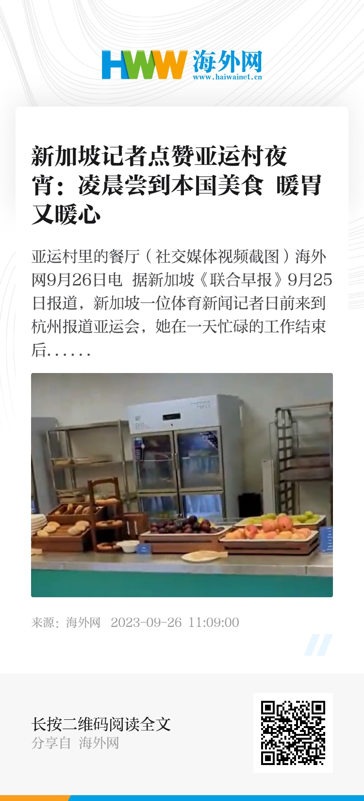 海外网9月26日电 据新加坡《联合早报》9月25日报道,新加坡一位体育新闻记者日前来到杭州报道亚运会,她在一天忙碌的工作结束后,在亚运村尝到了“催泪”夜宵,称赞美食“暖胃又暖心”。