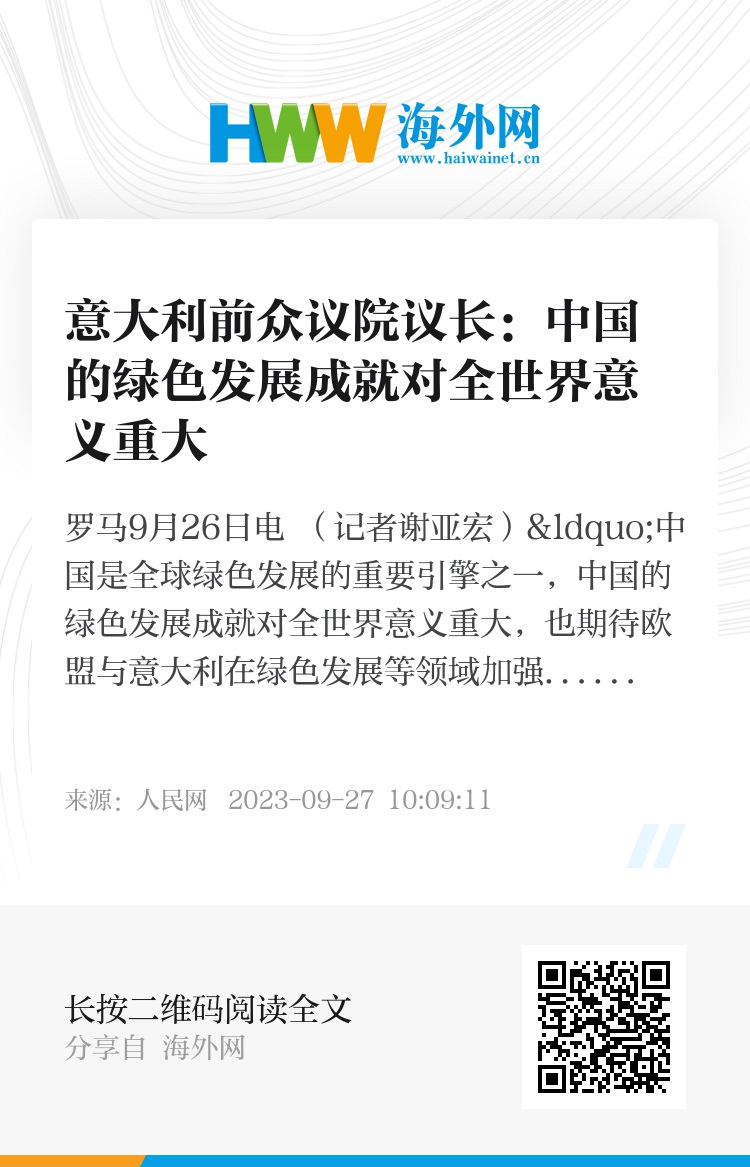 此外,她也指出,欧中绿色合作的前景广阔。“欧盟、意大利与中国都在绿色发展和技术领域积累了许多经验,进行务实合作、携手应对挑战十分必要。为此,我们应该确定优先事项清单并建立双方认可的标准,通过加强绿色金融领域合作加强全球不发达国家的绿色发展能力,实现绿色技术的广泛应用并为全人类带来可持续未来。”