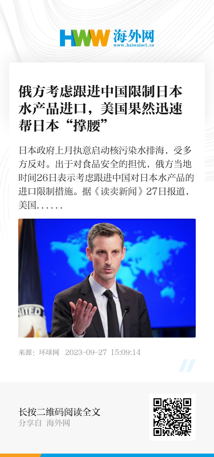 日本政府上月执意启动核污染水排海,受多方反对。出于对食品安全的担忧,俄方当地时间26日表示考虑跟进中国对日本水产品的进口限制措施。据《读卖新闻》27日报道,美国迅速对此事做出回应,与俄罗斯针锋相对。