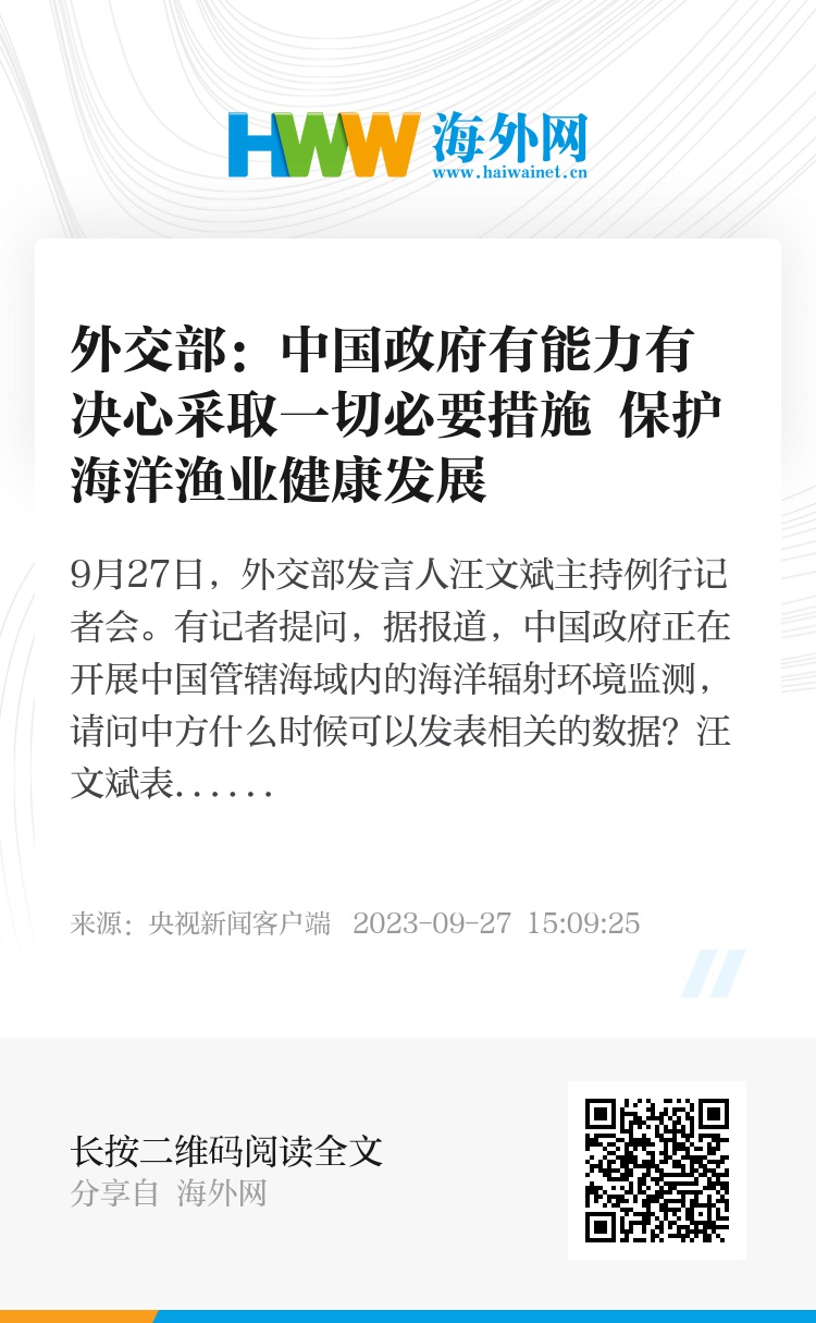 9月27日,外交部发言人汪文斌主持例行记者会。有记者提问,据报道,中国政府正在开展中国管辖海域内的海洋辐射环境监测,请问中方什么时候可以发表相关的数据?