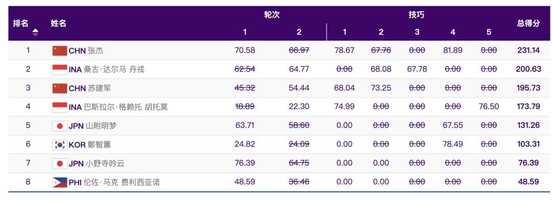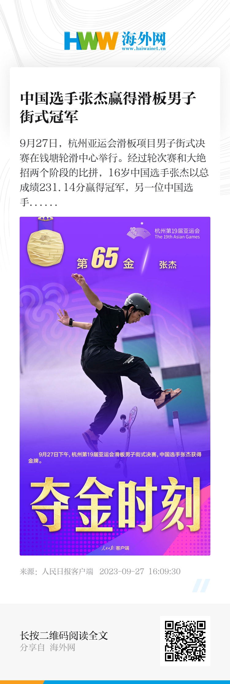 9月27日,杭州亚运会滑板项目男子街式决赛在钱塘轮滑中心举行。经过轮次赛和大绝招两个阶段的比拼,16岁中国选手张杰以总成绩231.14分赢得冠军,另一位中国选手苏建军收获铜牌。