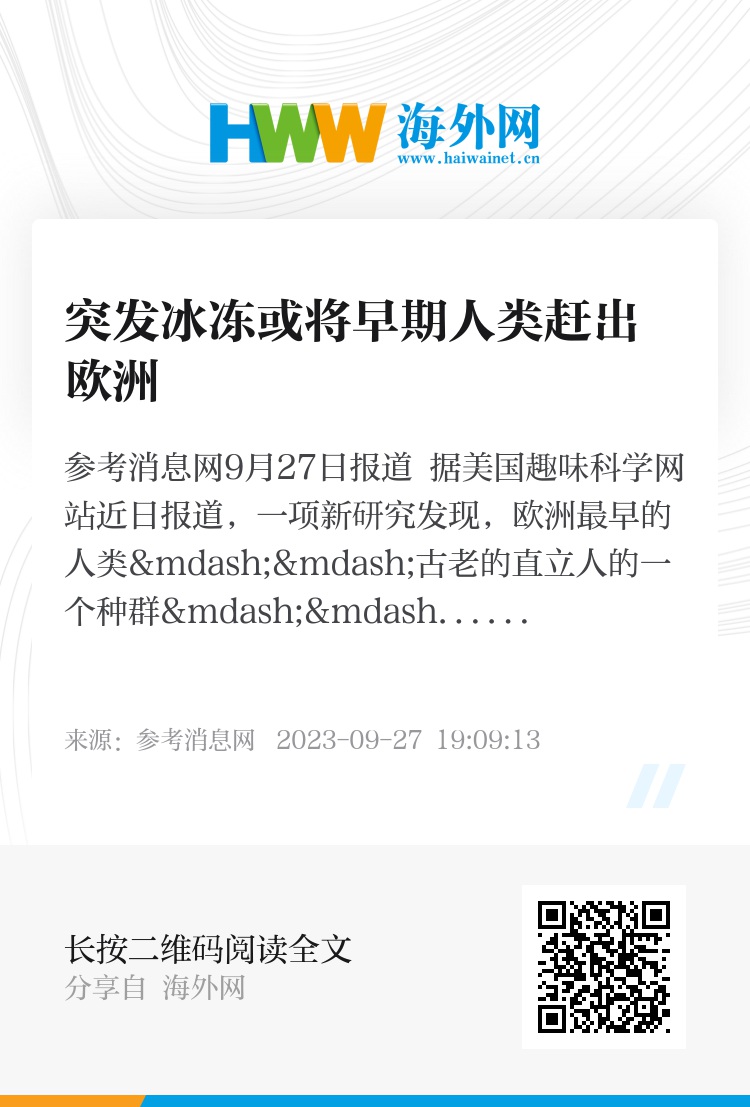 参考消息网9月27日报道 据美国趣味科学网站近日报道,一项新研究发现,欧洲最早的人类——古老的直立人的一个种群——很可能在大约110万年前的一场“极端降温事件”中遭遇了灭顶之灾。