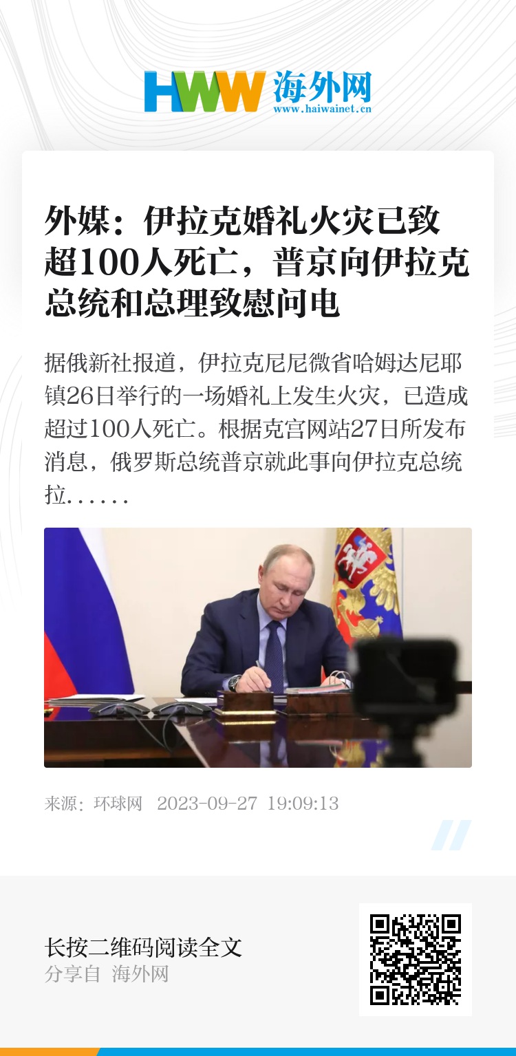 据俄新社报道,伊拉克尼尼微省哈姆达尼耶镇26日举行的一场婚礼上发生火灾,已造成超过100人死亡。根据克宫网站27日所发布消息,俄罗斯总统普京就此事向伊拉克总统拉希德和总理苏丹尼致慰问电。