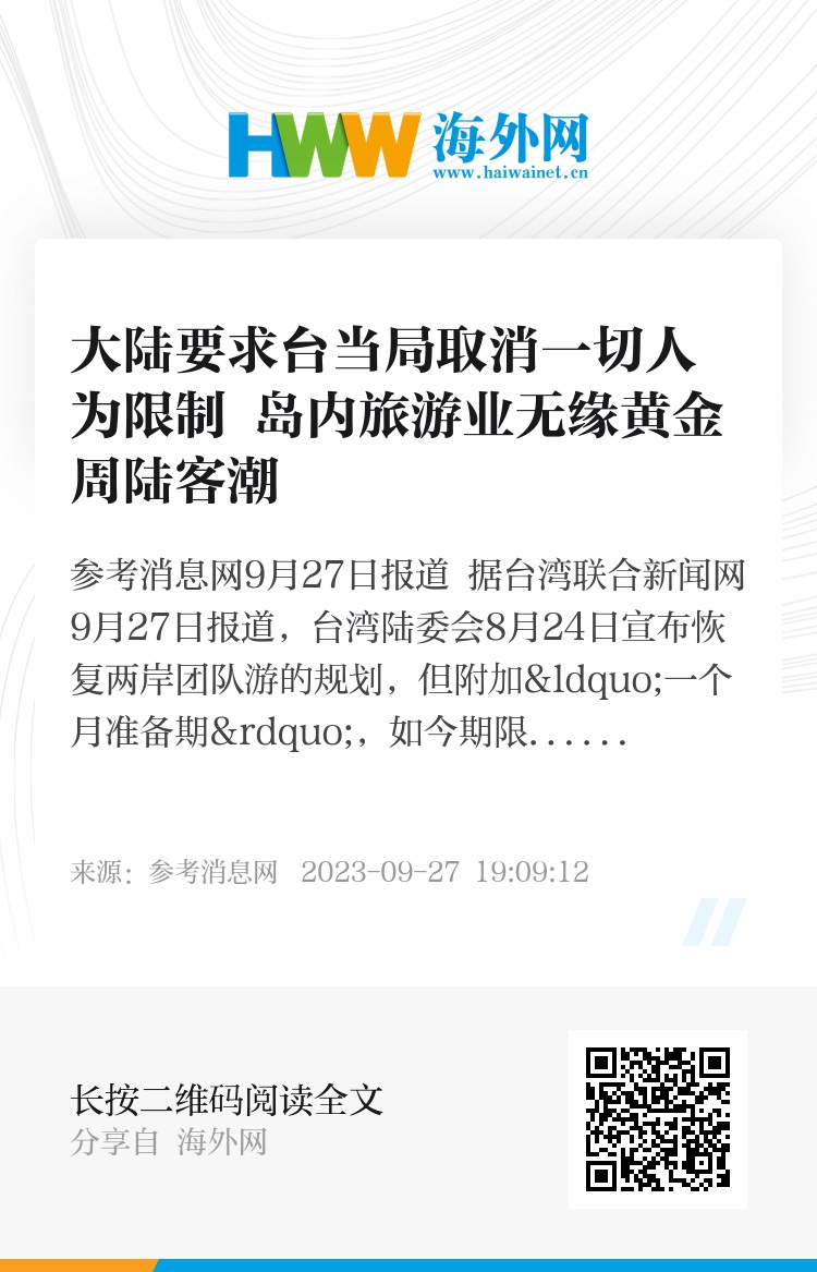 报道最后说,蔡当局不断强调对等开放,连“观光署”也难以插手此事,今年以来种种“若有似无”的政策,最后都像是“打假球”,让民间各种期待都落空。大陆疫后首个黄金周长假将涌出可观旅客量,在各国敞开大门出招迎接的同时,台湾业者仍看得到却吃不到,岂不是再度重创台湾的旅游业?