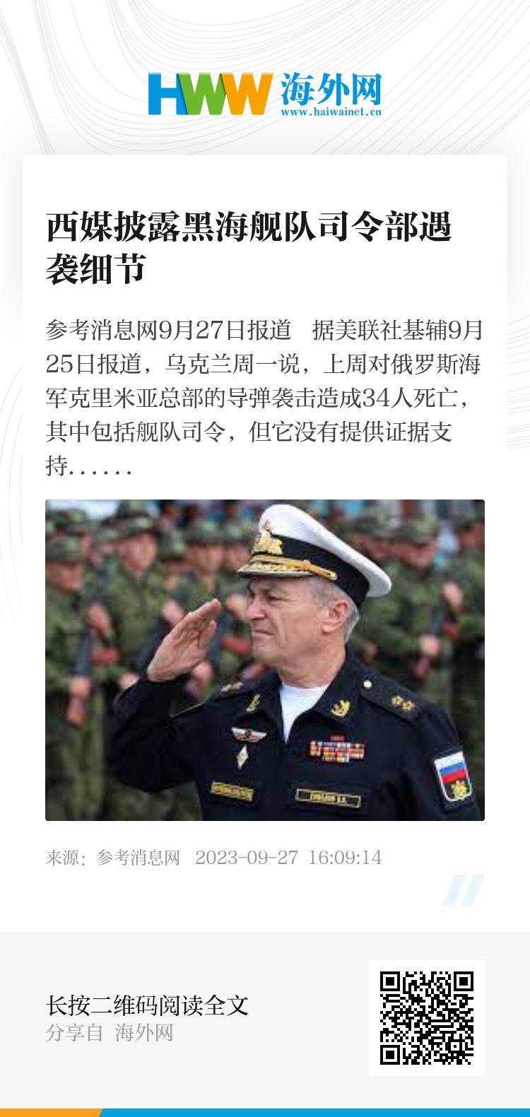参考消息网9月27日报道 据美联社基辅9月25日报道,乌克兰周一说,上周对俄罗斯海军克里米亚总部的导弹袭击造成34人死亡,其中包括舰队司令,但它没有提供证据支持这一说法。