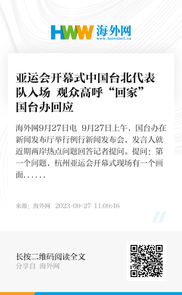 朱凤莲:第一个问题。在杭州亚运会期间,中国台北代表团一定会从始至终都能感受到大陆观众给予的“家的主场”的氛围。