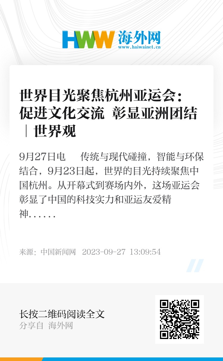 中新网9月27日电 传统与现代碰撞,智能与环保结合,9月23日起,世界的目光持续聚焦中国杭州。从开幕式到赛场内外,这场亚运会彰显了中国的科技实力和亚运友爱精神,引发境外媒体和国际知名人士关注。