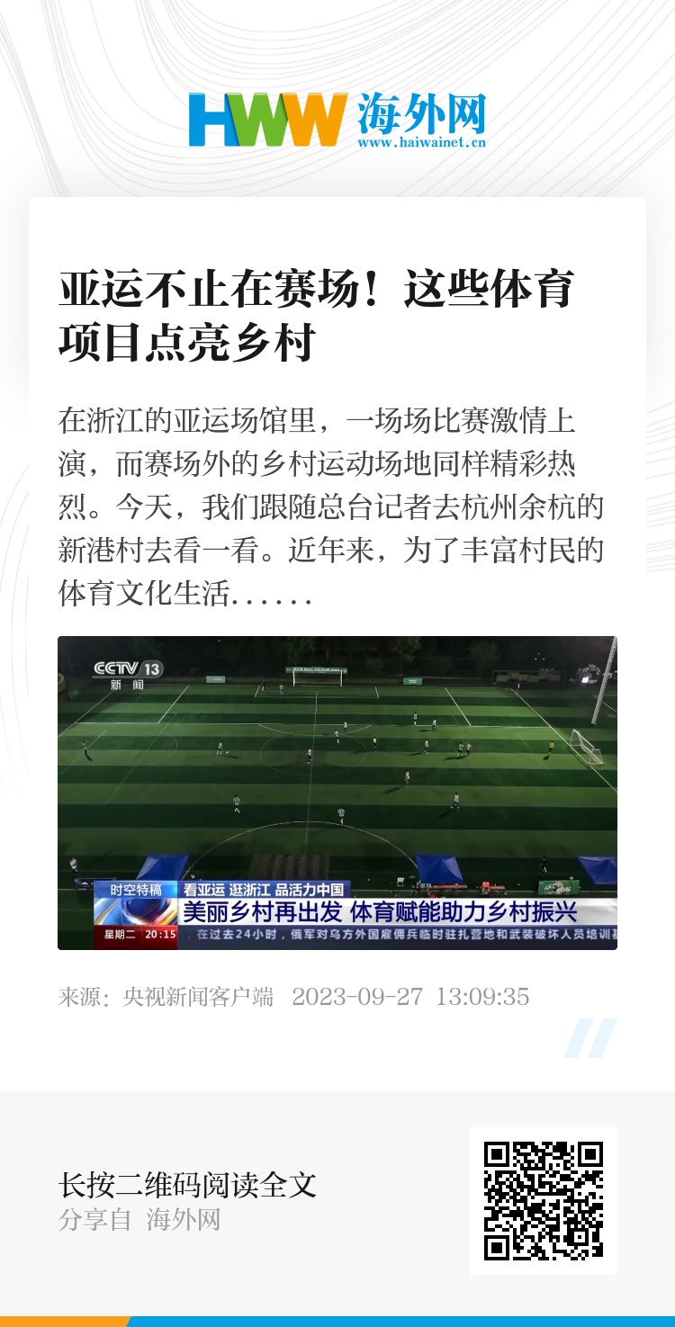 在浙江的亚运场馆里,一场场比赛激情上演,而赛场外的乡村运动场地同样精彩热烈。今天,我们跟随总台记者去杭州余杭的新港村去看一看。近年来,为了丰富村民的体育文化生活,新港村不仅建起了足球场、篮球场、波浪道、室内体育馆,还经常组织各类体育赛事。在乡村振兴的道路上,新港村已从原来的“农业+旅游”的模式提升为“体育+农业+旅游”的模式,一个个体育项目、一块块体育场地正在点亮乡村。