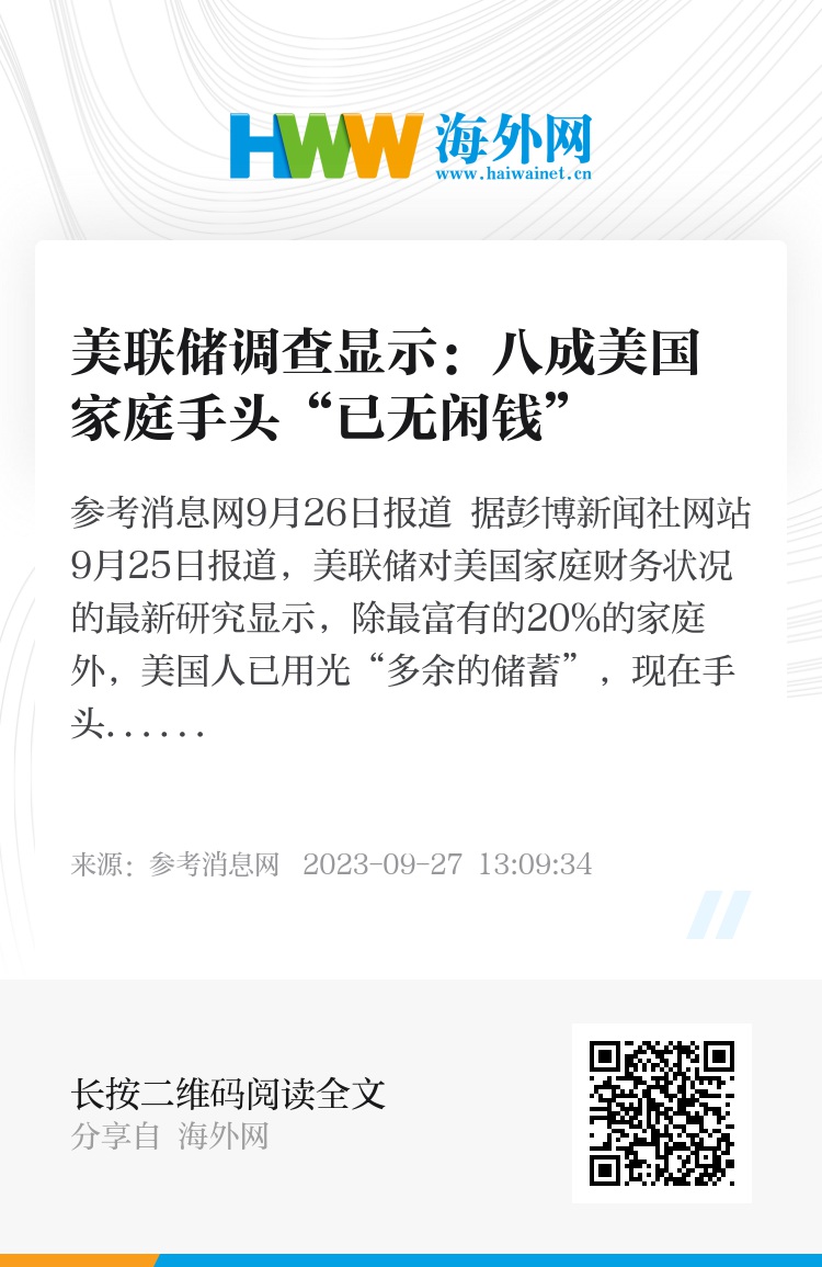 参考消息网9月26日报道 据彭博新闻社网站9月25日报道,美联储对美国家庭财务状况的最新研究显示,除最富有的20%的家庭外,美国人已用光“多余的储蓄”,现在手头的现金比新冠疫情暴发时还少。