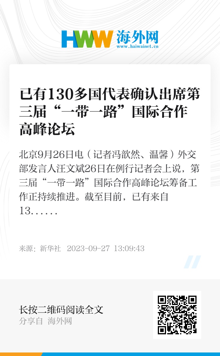新华社北京9月26日电(记者冯歆然、温馨)外交部发言人汪文斌26日在例行记者会上说,第三届“一带一路”国际合作高峰论坛筹备工作正持续推进。截至目前,已有来自130多个国家的代表确认与会,还有很多国际组织代表确认参会。