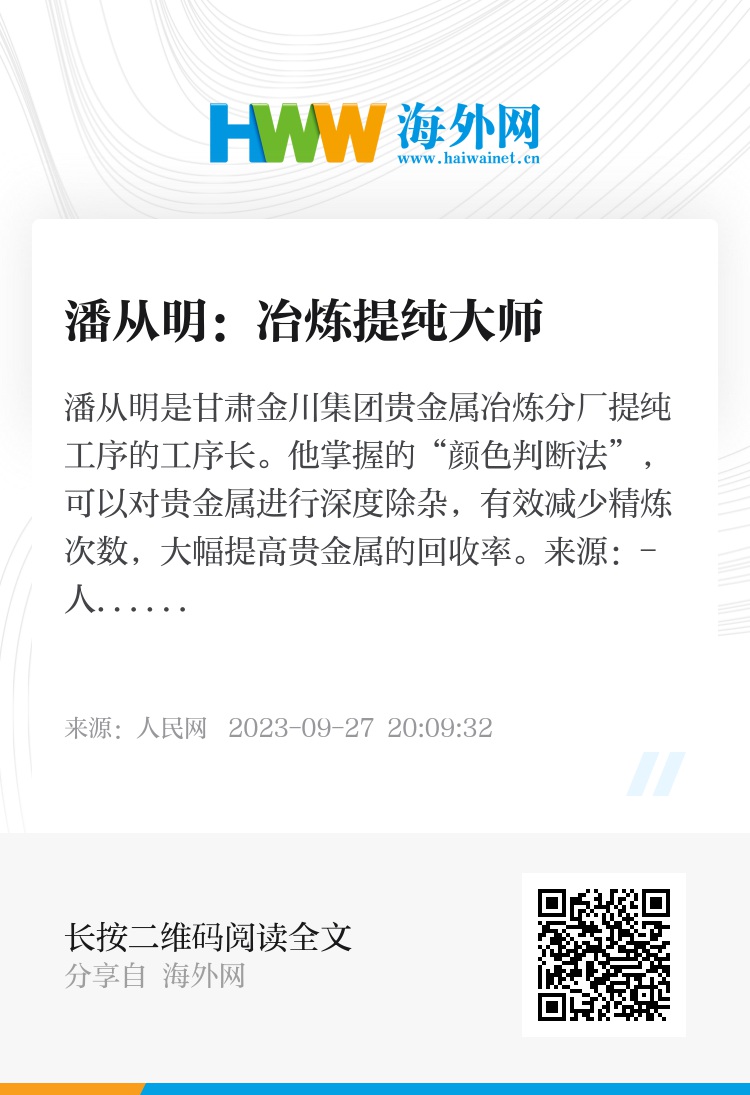 潘从明是甘肃金川集团贵金属冶炼分厂提纯工序的工序长。他掌握的“颜色判断法”,可以对贵金属进行深度除杂,有效减少精炼次数,大幅提高贵金属的回收率。