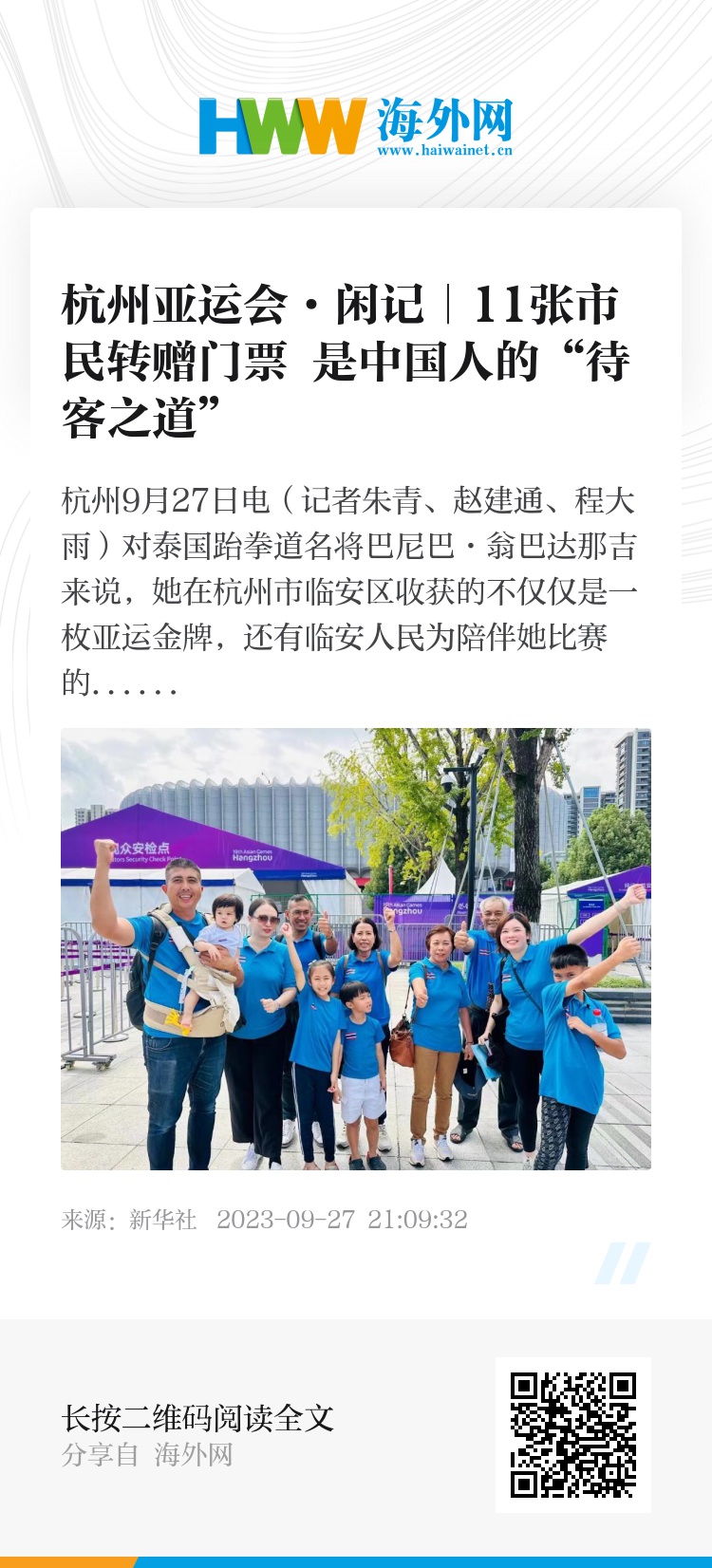 新华社杭州9月27日电(记者朱青、赵建通、程大雨)对泰国跆拳道名将巴尼巴·翁巴达那吉来说,她在杭州市临安区收获的不仅仅是一枚亚运金牌,还有临安人民为陪伴她比赛的“亲友团”送来的11张临时转赠门票。“感受到了无比的热情和温暖。”她说。而可爱的临安人民则表示,这就是我们中国人的待客之道。