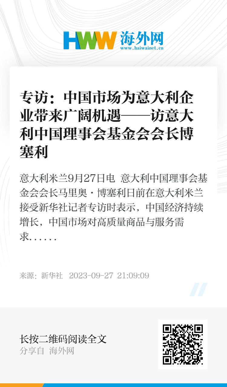 博塞利表示,中国市场规模巨大且增长势头强劲,消费者对高质量、创新型的商品和服务保持高需求,特别是在时尚、农业等领域,这对计划扩大海外经营的意大利企业而言“机不可失”。