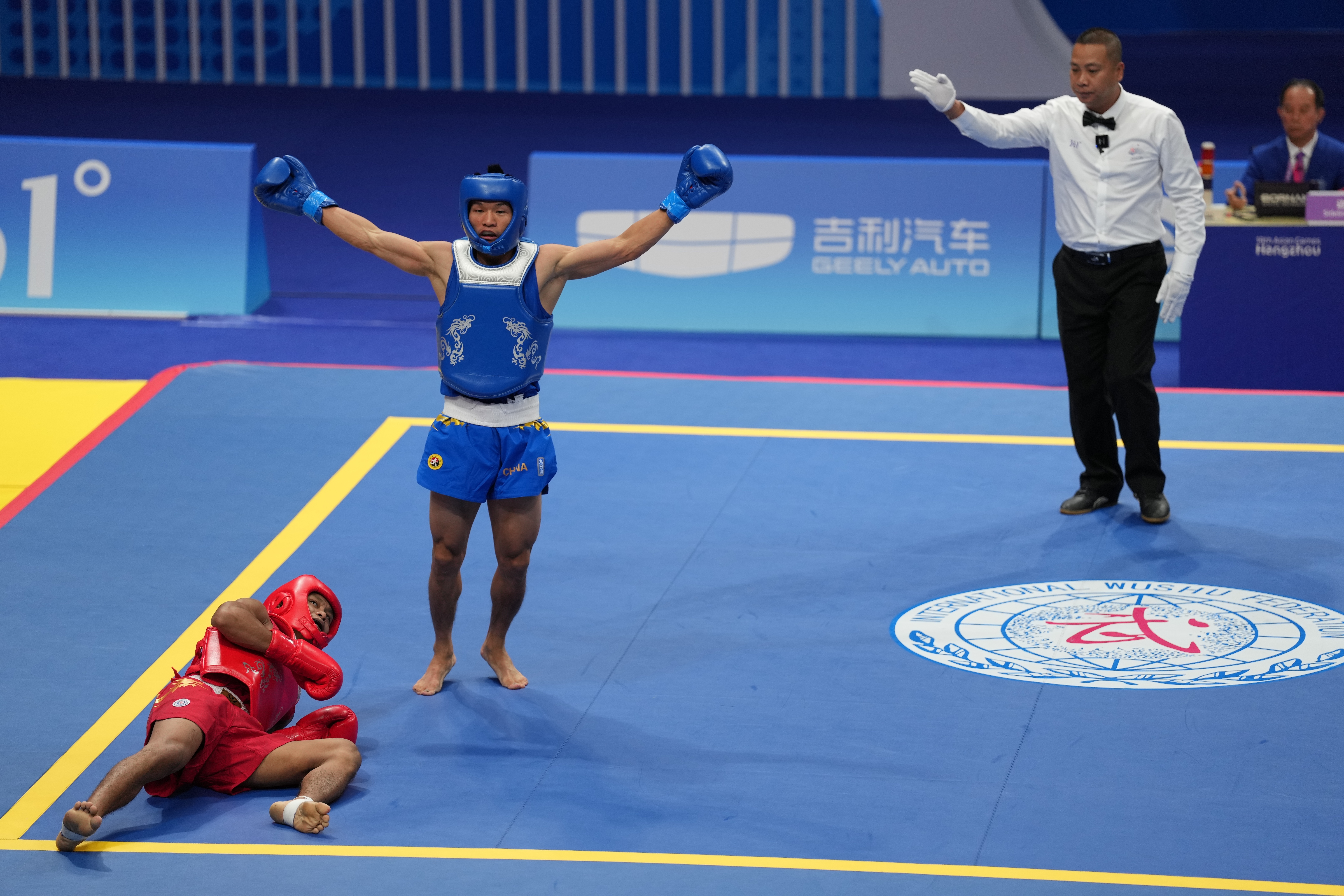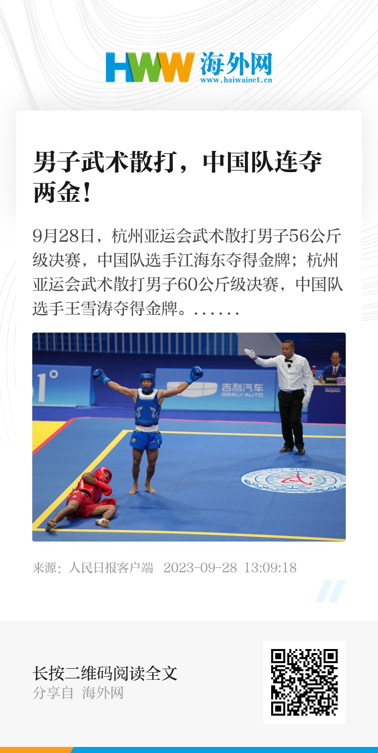 9月28日,杭州亚运会武术散打男子56公斤级决赛,中国队选手江海东夺得金牌;杭州亚运会武术散打男子60公斤级决赛,中国队选手王雪涛夺得金牌。