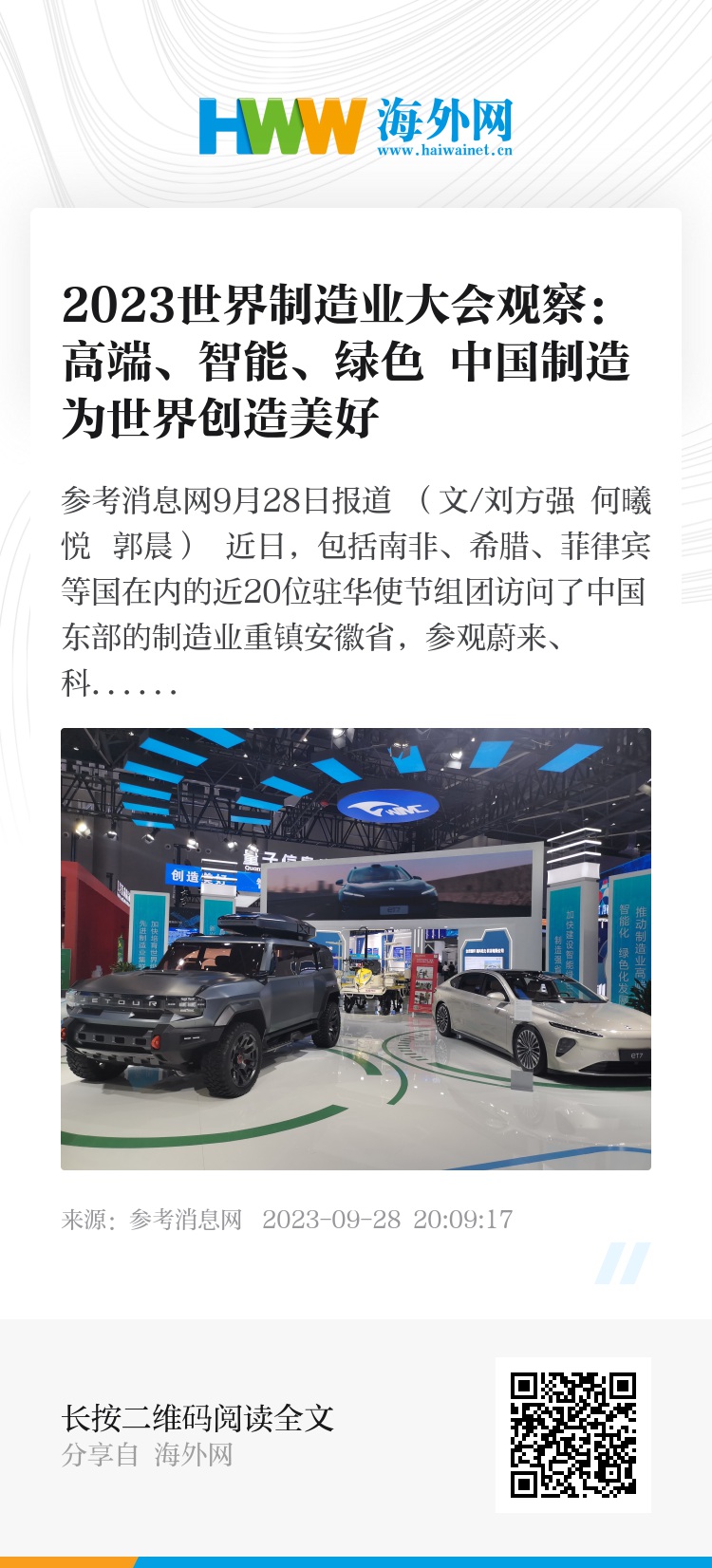 参考消息网9月28日报道(文/刘方强 何曦悦 郭晨) 近日,包括南非、希腊、菲律宾等国在内的近20位驻华使节组团访问了中国东部的制造业重镇安徽省,参观蔚来、科大讯飞等企业,出席2023世界制造业大会开幕式并观展……中国制造业的飞速发展令他们印象深刻,“高端、智能、绿色”成为此次制造业探索之旅的关键词。