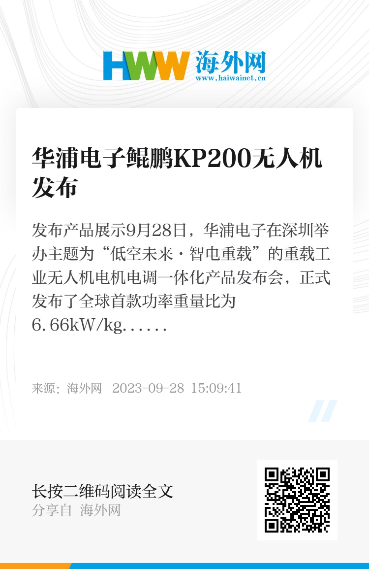 9月28日,华浦电子在深圳举办主题为“低空未来·智电重载”的重载工业无人机电机电调一体化产品发布会,正式发布了全球首款功率重量比为6.66kW/kg的鲲鹏 KP200型无人机。
