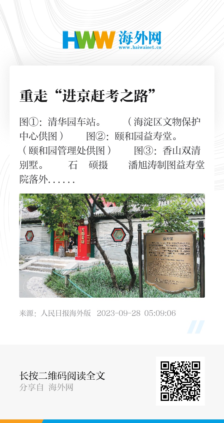 从清华园车站旧址到颐和园益寿堂,再到中共中央香山驻地旧址、香山革命纪念馆,今年3月25日,“进京赶考之路(北京段)”串珠成线,全貌亮相。截至目前,“进京赶考之路(北京段)”累计接待观众约100万人次,成为热门红色文化打卡地。在国庆节来临之际,请读者跟随本报记者重走这条全长28公里的“进京赶考之路”革命文物主题游径,一起感受中国共产党人的初心和使命。