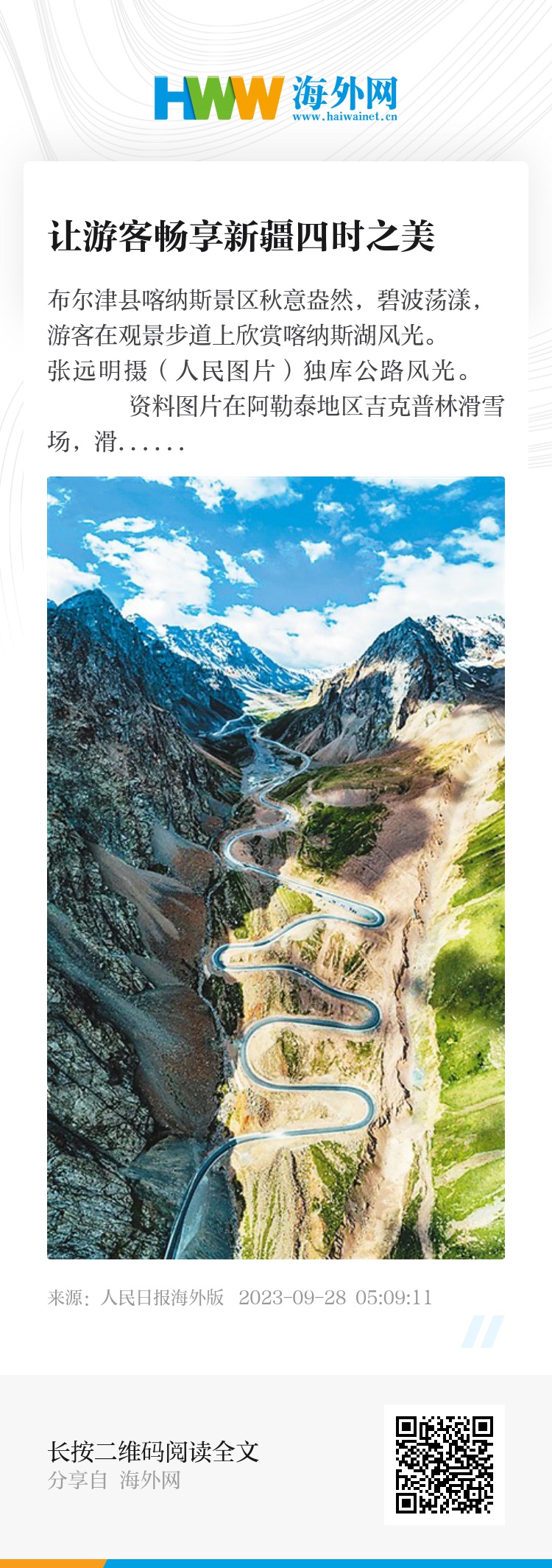 “今年,气象部门将为游客实时提供独库公路沿线14个重要节点的未来3天天气预报信息,保障游客安全出行,提升自驾游舒适度。”新疆维吾尔自治区气象局局长崔彩霞告诉记者,近年来,围绕“旅游兴疆”战略,气象部门通过完善观测网络、挖掘气候资源、丰富服务产品等方式,助力新疆旅游业高质量发展,让游客畅享新疆四时风光。