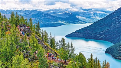 布尔津县喀纳斯景区秋意盎然,碧波荡漾,游客在观景步道上欣赏喀纳斯湖风光。