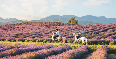 游客在伊犁河谷西北部的霍城县芦草沟镇薰衣草农场骑马游玩。