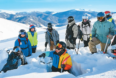 在阿勒泰地区吉克普林滑雪场,滑雪爱好者彭超(前)为雪友分析雪层特点。