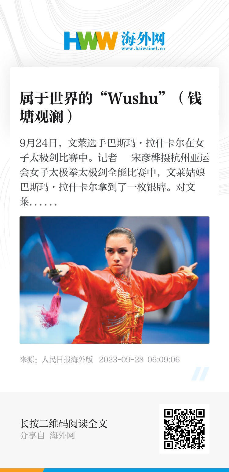 杭州亚运会女子太极拳太极剑全能比赛中,文莱姑娘巴斯玛·拉什卡尔拿到了一枚银牌。对文莱体育来说,这是一件大喜事儿——该国在亚运会历史上的最好成绩是铜牌。杭州亚运会上的银牌,让该国实现了突破。