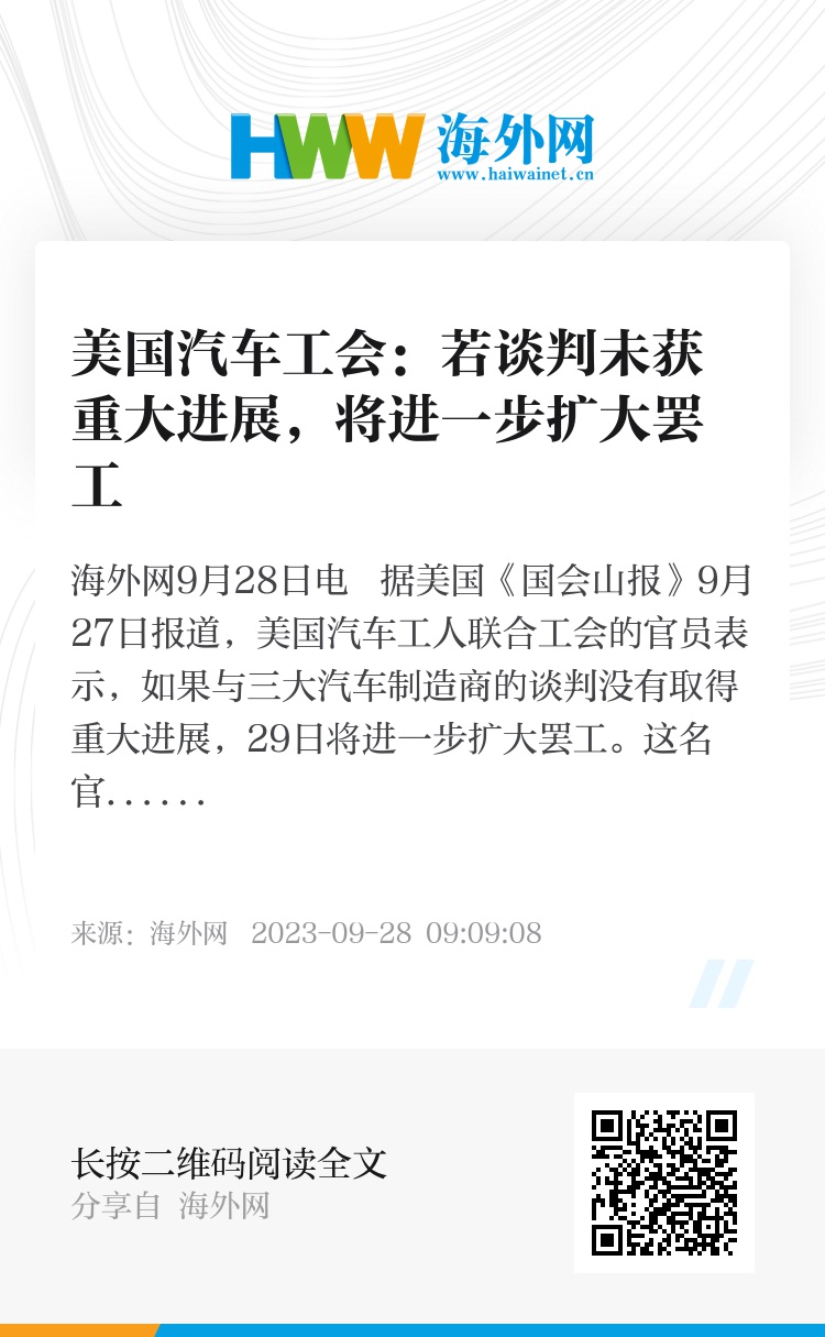 海外网9月28日电 据美国《国会山报》9月27日报道,美国汽车工人联合工会的官员表示,如果与三大汽车制造商的谈判没有取得重大进展,29日将进一步扩大罢工。