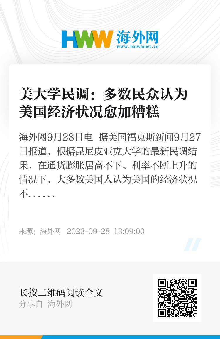 海外网9月28日电 据美国福克斯新闻9月27日报道,根据昆尼皮亚克大学的最新民调结果,在通货膨胀居高不下、利率不断上升的情况下,大多数美国人认为美国的经济状况不佳,并且愈加糟糕。