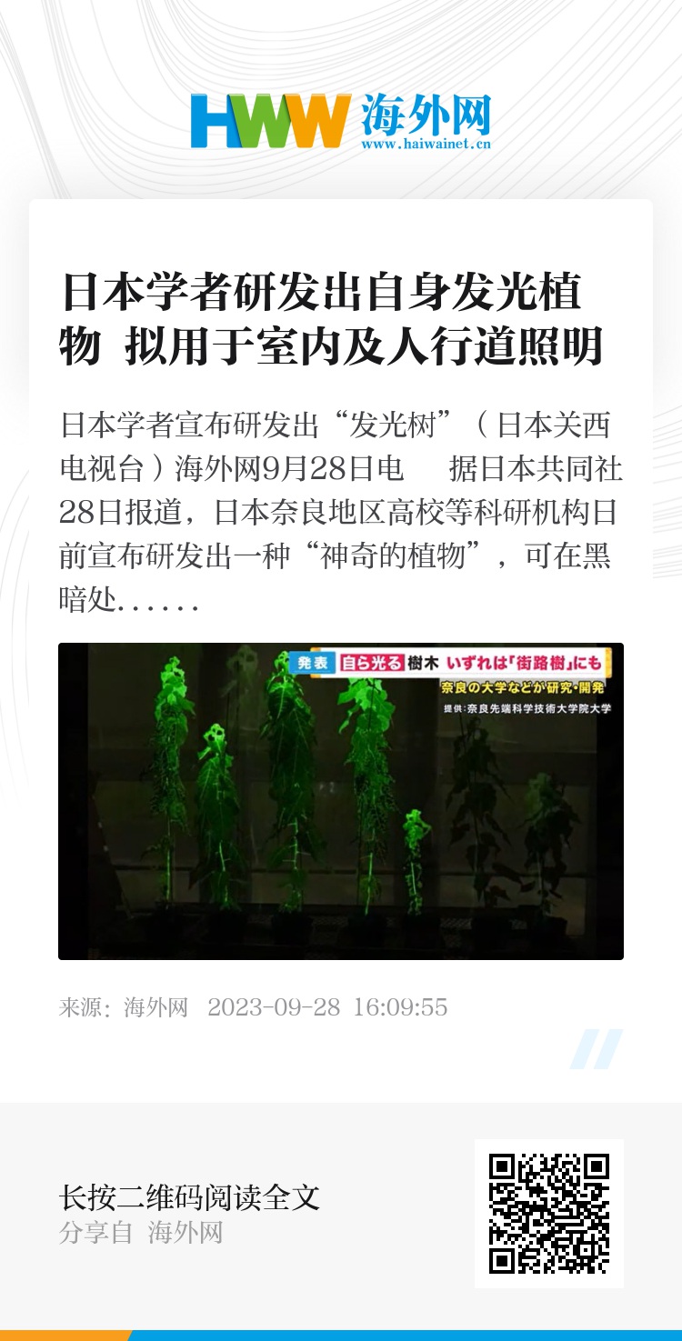 海外网9月28日电 据日本共同社28日报道,日本奈良地区高校等科研机构日前宣布研发出一种“神奇的植物”,可在黑暗处发光。