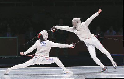 9月28日,中国选手梁建豪(右)与韩国选手金准镐在在亚运会击剑项目男子团体佩剑比赛中。