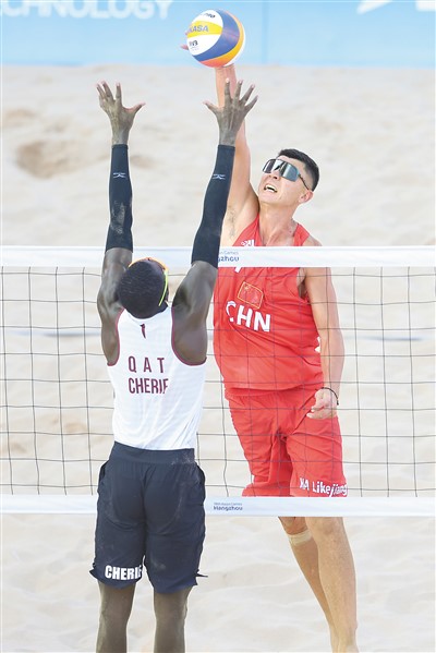 9月28日,中国组合获亚运会沙滩排球男子组亚军。图为中国队员(右)在比赛中。