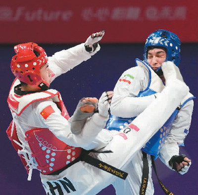 9月28日,中国选手宋兆祥(左)获得亚运会跆拳道男子80公斤以上级金牌。