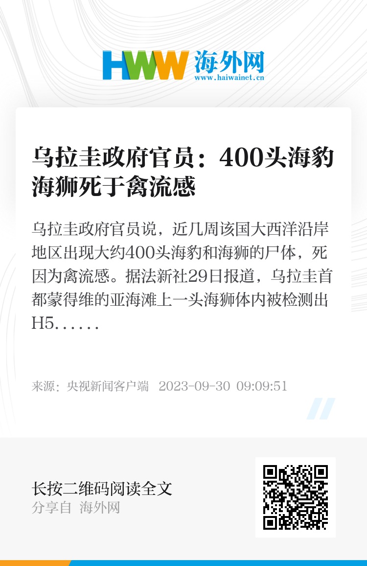 乌拉圭政府官员说,近几周该国大西洋沿岸地区出现大约400头海豹和海狮的尸体,死因为禽流感。