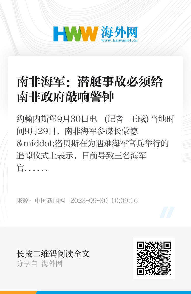 中新网约翰内斯堡9月30日电 (记者 王曦)当地时间9月29日,南非海军参谋长蒙德·洛贝斯在为遇难海军官兵举行的追悼仪式上表示,日前导致三名海军官兵死亡的潜艇事故暴露了当前存在的安全隐患,必须给南非政府敲响警钟。