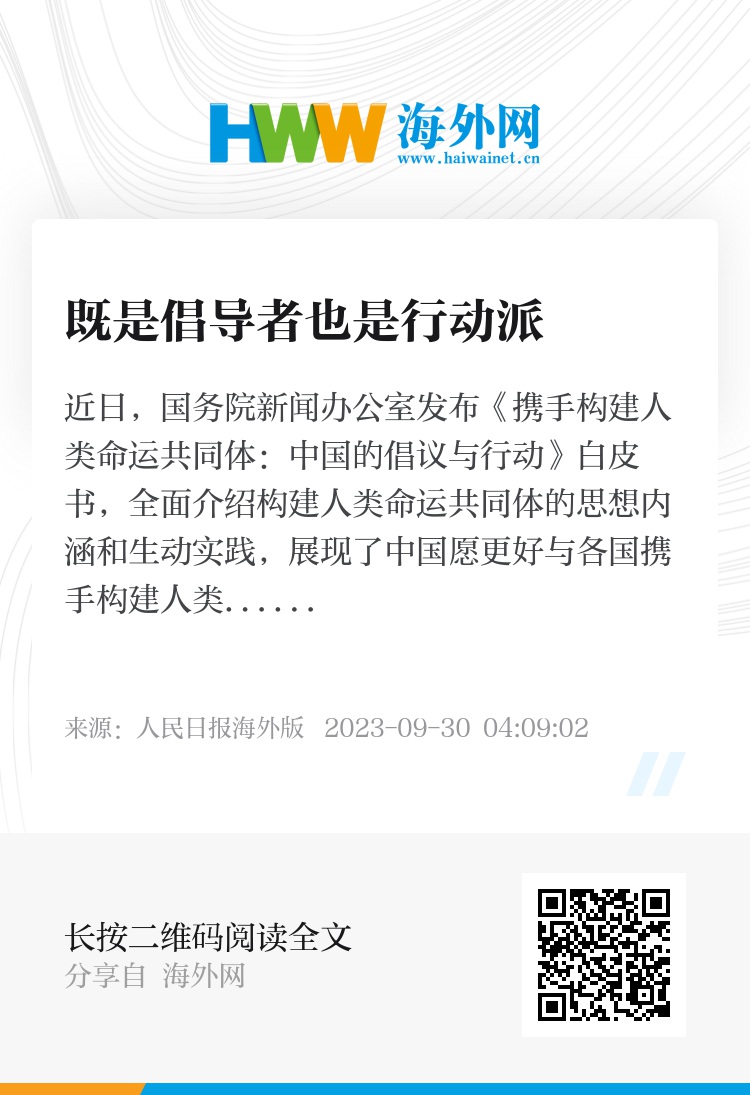 白皮书指出,中国既是倡导者也是行动派。10年来,中国用笃定的信念和扎实的行动,为构建人类命运共同体贡献中国力量。中国推动高质量共建“一带一路”,落实“三大全球倡议”,与越来越多的国家和地区共同行动,为各领域国际合作注入强劲动力。