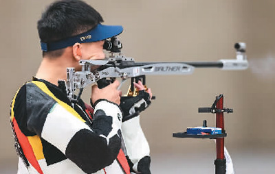 9月29日,中国选手田珈铭在亚运会射击项目男子50米步枪3种姿势个人决赛中获得铜牌。新华社记者 单宇琦摄