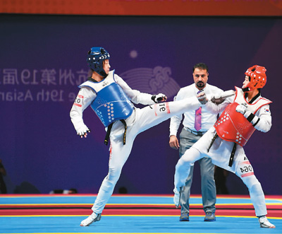 9月28日,在亚运会跆拳道女子+67公斤级金牌赛上,中国队选手周泽琪(左)击败了韩国选手,获得了冠军。胡建强摄