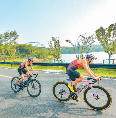 9月29日,亚运会铁人三项项目在淳安赛区开赛,选手进行自行车比赛。杨 波摄