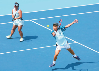 9月29日,中国台北运动员黄琮豪与队友在亚运会网球项目混合双打半决赛中成功晋级。新华社记者 孟晨光摄