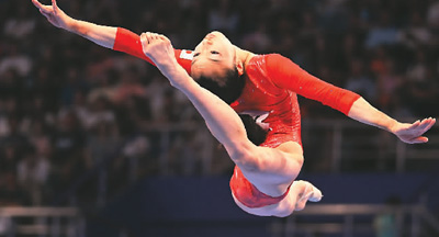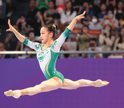 9月29日,中国选手章瑾在亚运会竞技体操项目女子自由体操决赛中以13.100分获得冠军。新华社记者 程婷婷摄