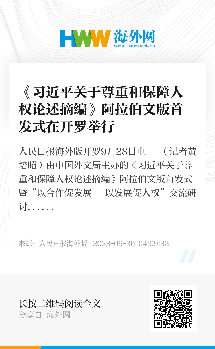 人民日报海外版开罗9月28日电 (记者黄培昭)由中国外文局主办的《习近平关于尊重和保障人权论述摘编》阿拉伯文版首发式暨“以合作促发展 以发展促人权”交流研讨会27日在埃及首都开罗举行。