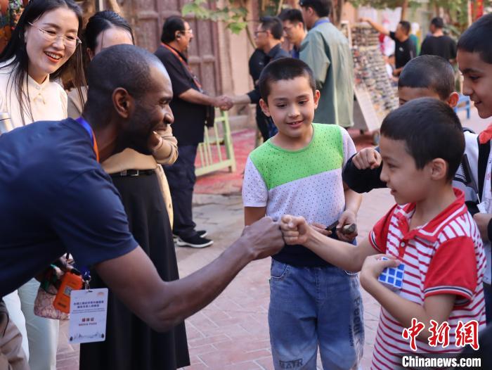 近日,外国媒体人在喀什古城与当地儿童击拳问好。 中新社记者 薄雯雯 摄