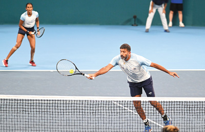 9月30日,印度选手鲁图贾·桑帕特拉奥·博萨莱与队友获得亚运会网球项目混合双打冠军。新华社记者 程 敏摄