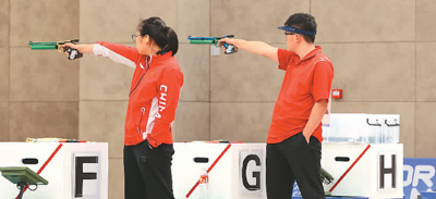 9月30日,中国组合张博文(右)/姜冉馨夺得亚运会射击项目混合团体10米气手枪冠军。新华社记者 单宇琦摄