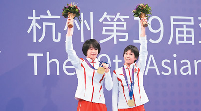 9月30日,中国组合全红婵(右)/陈芋汐获得亚运会跳水项目女子双人10米跳台冠军。新华社记者 薛宇舸摄