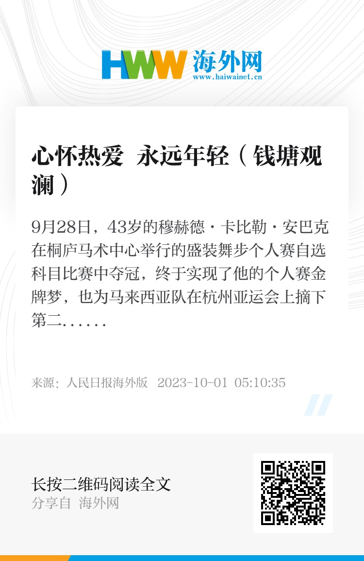 9月28日,43岁的穆赫德·卡比勒·安巴克在桐庐马术中心举行的盛装舞步个人赛自选科目比赛中夺冠,终于实现了他的个人赛金牌梦,也为马来西亚队在杭州亚运会上摘下第二枚金牌。