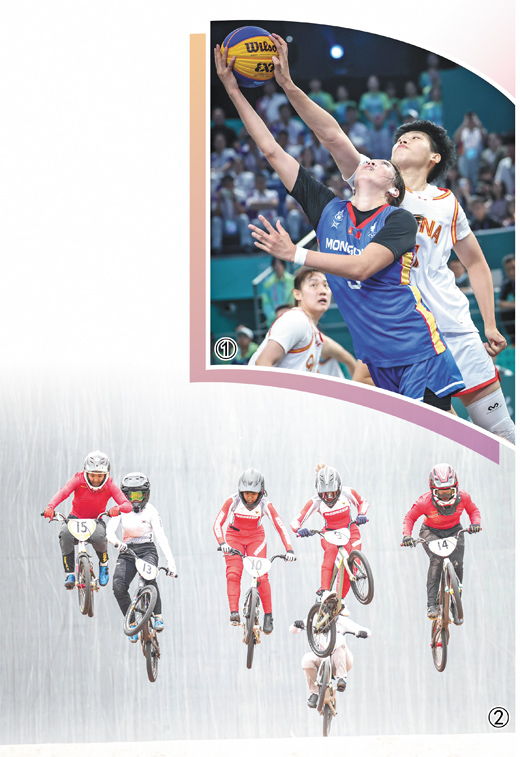 图①:10月1日,三人篮球项目女子U23(23岁以下)金牌决赛,中国体育代表团选手陈明伶(右)在比赛中。新华社记者 潘昱龙摄