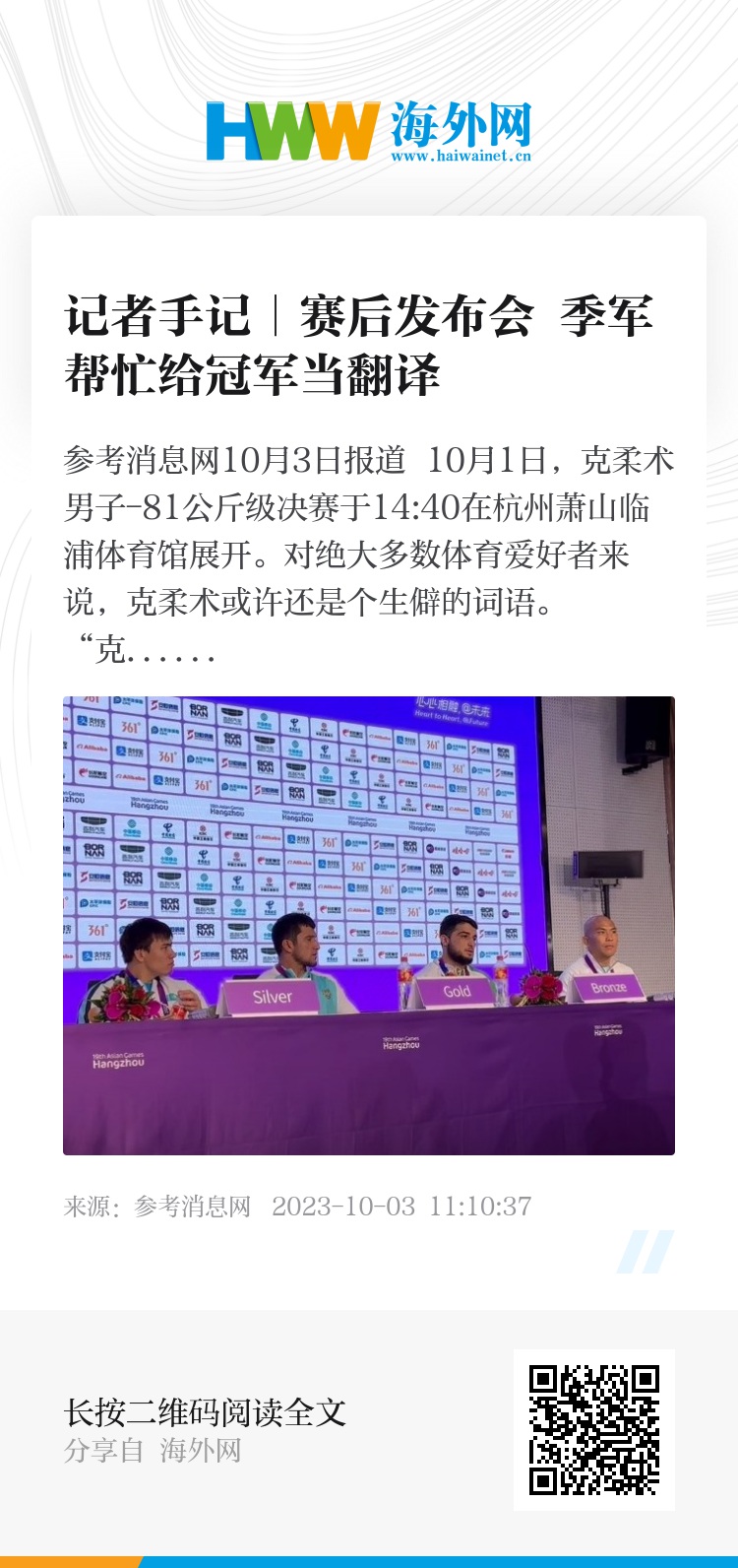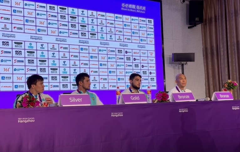 现场大部分是中国记者或以英文为主的外国记者,大家因此面面相觑。一名外国记者用英文问4位选手获奖后的感受,主持人请乌米德·埃萨诺夫先回答。但他似乎没听懂,没给出任何反应。主持人尴尬询问,谁可以翻译一下乌兹别克语。一名似乎来自阿富汗的记者跟阿富汗季军得主沟通后说,拉苏利(季军)可以与冠军沟通,然后翻译给自己(记者本人),他本人会说一点点英语,或许可以帮上忙。在季军得主的协助下,冠军得主拿起话筒表达了自己参加杭州亚运会并获得冠军的喜悦之情。后续的发布会采访,也以这种略微复杂的形式得以顺利进行。 (记者 王天僚)