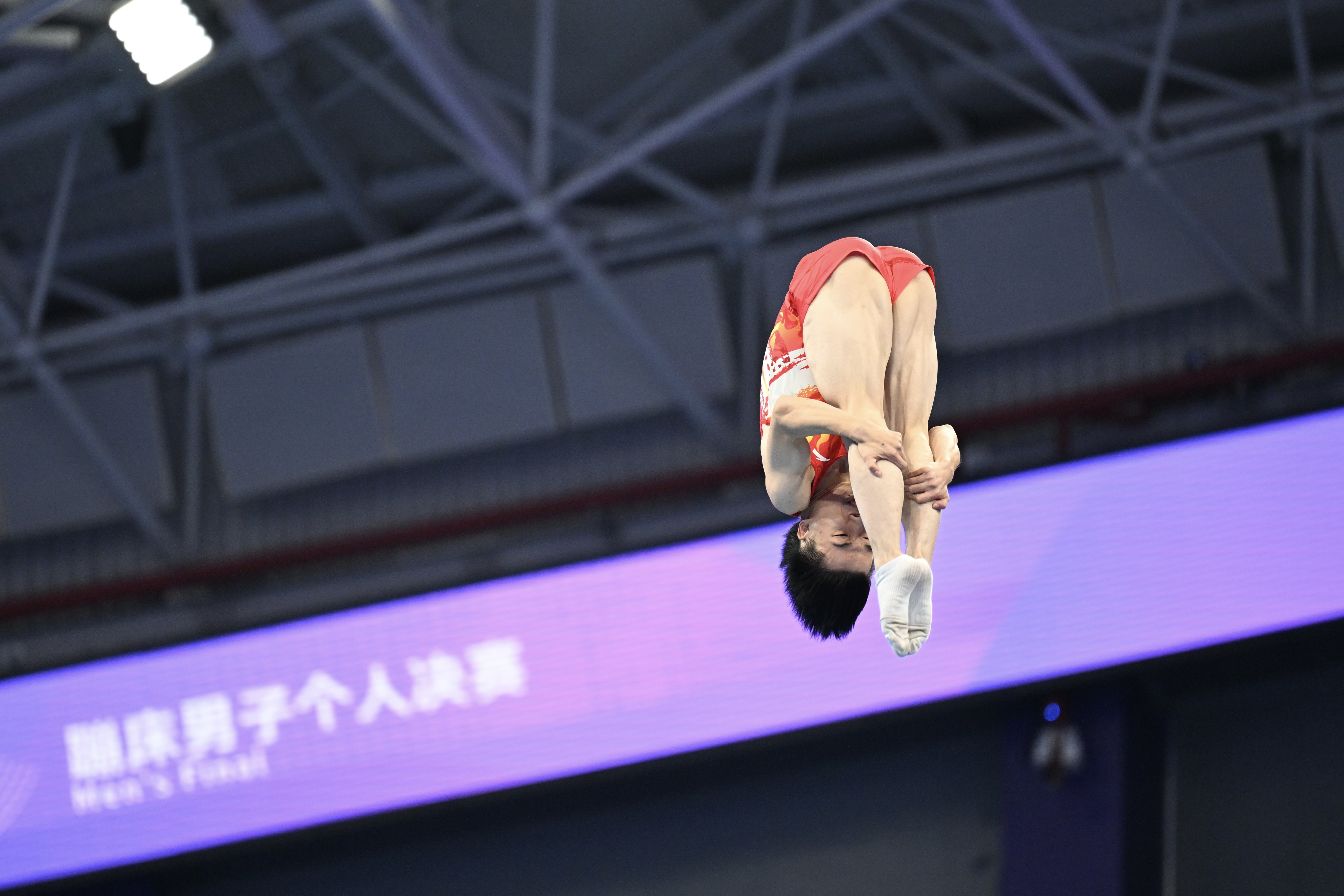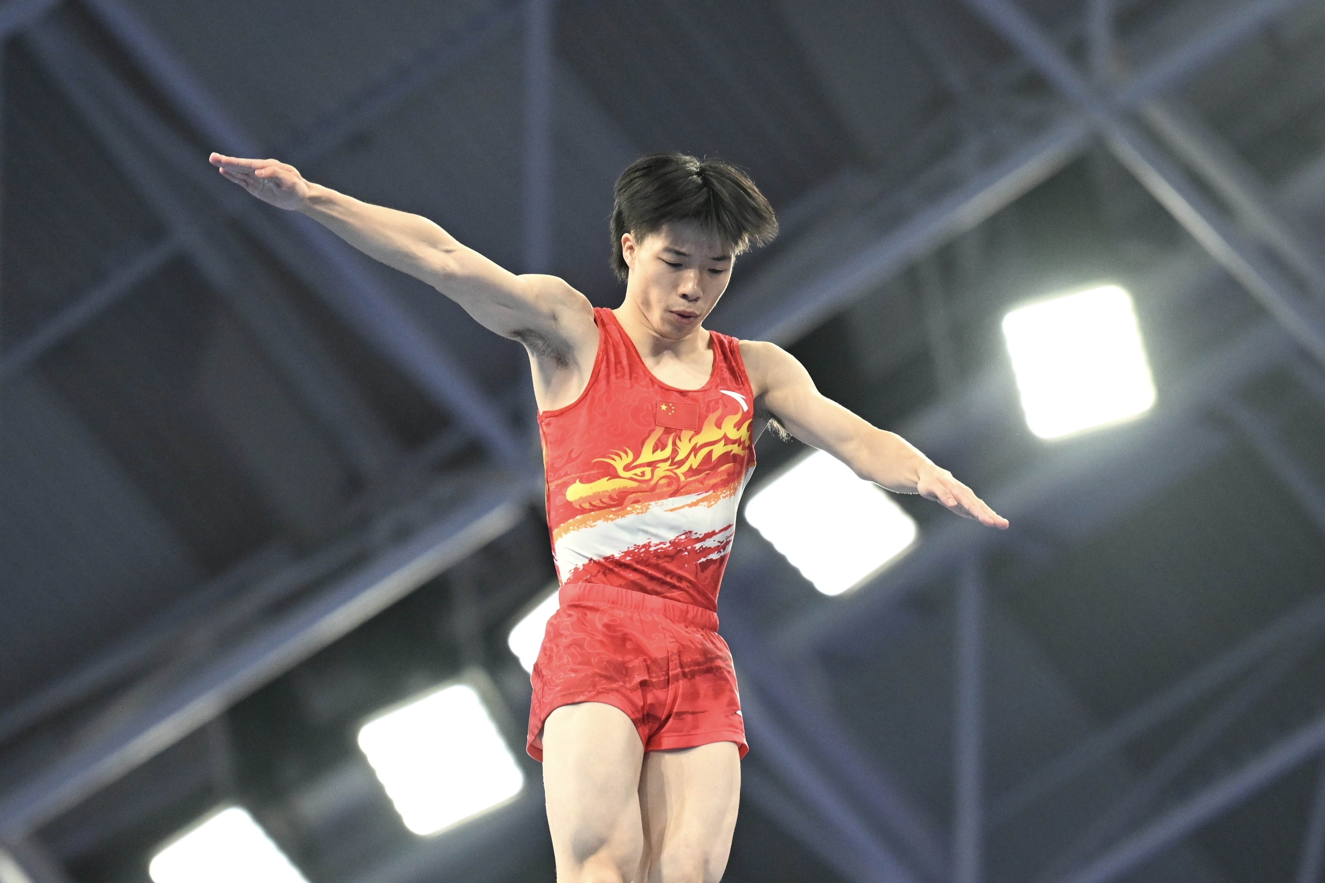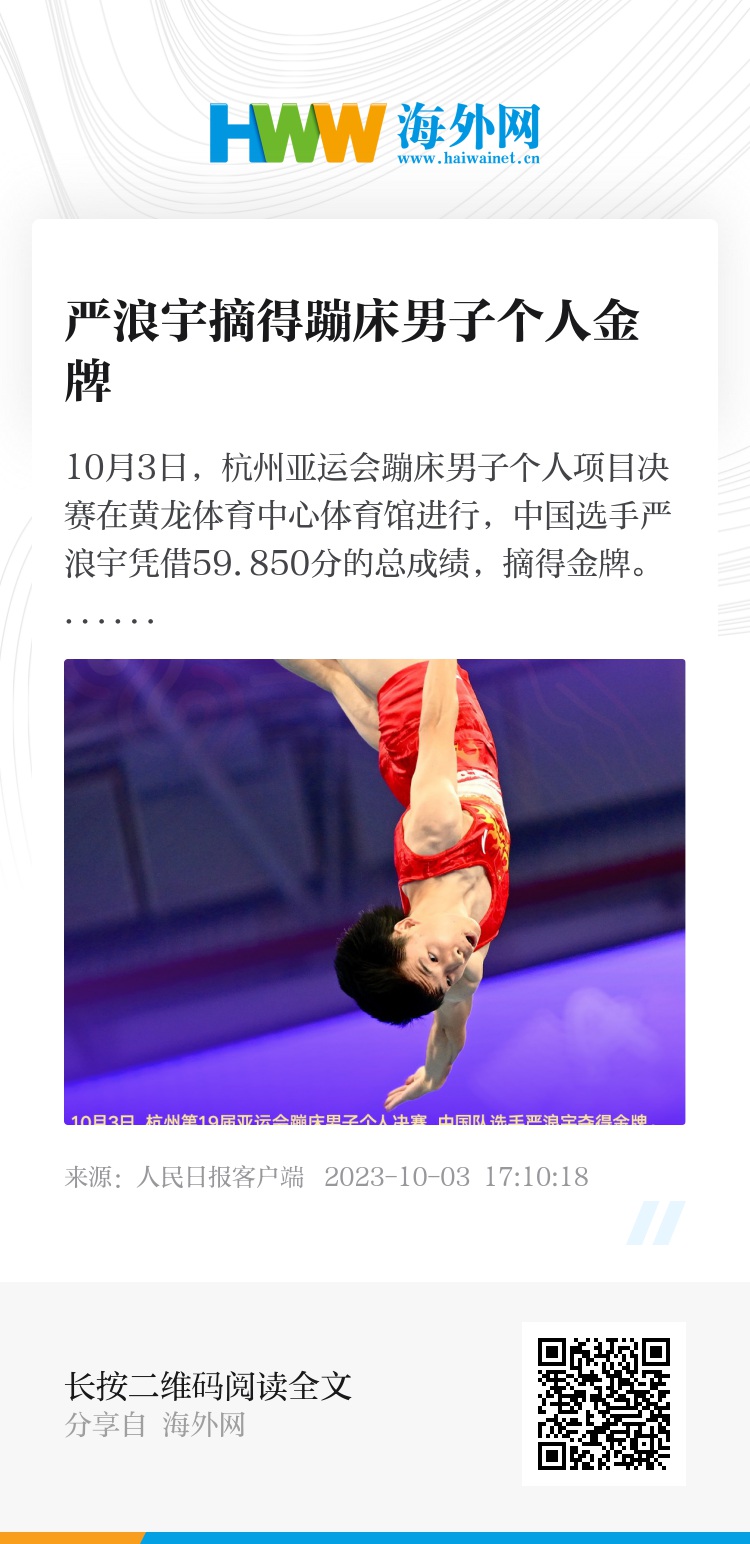 10月3日,杭州亚运会蹦床男子个人项目决赛在黄龙体育中心体育馆进行,中国选手严浪宇凭借59.850分的总成绩,摘得金牌。
