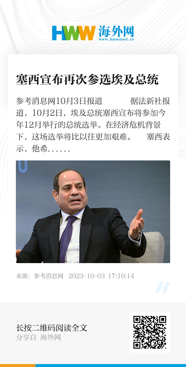 参考消息网10月3日报道 据法新社报道,10月2日,埃及总统塞西宣布将参加今年12月举行的总统选举。在经济危机背景下,这场选举将比以往更加艰难。